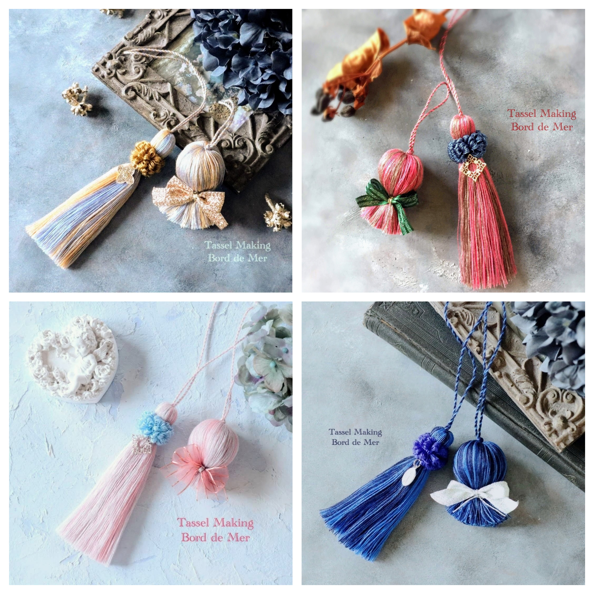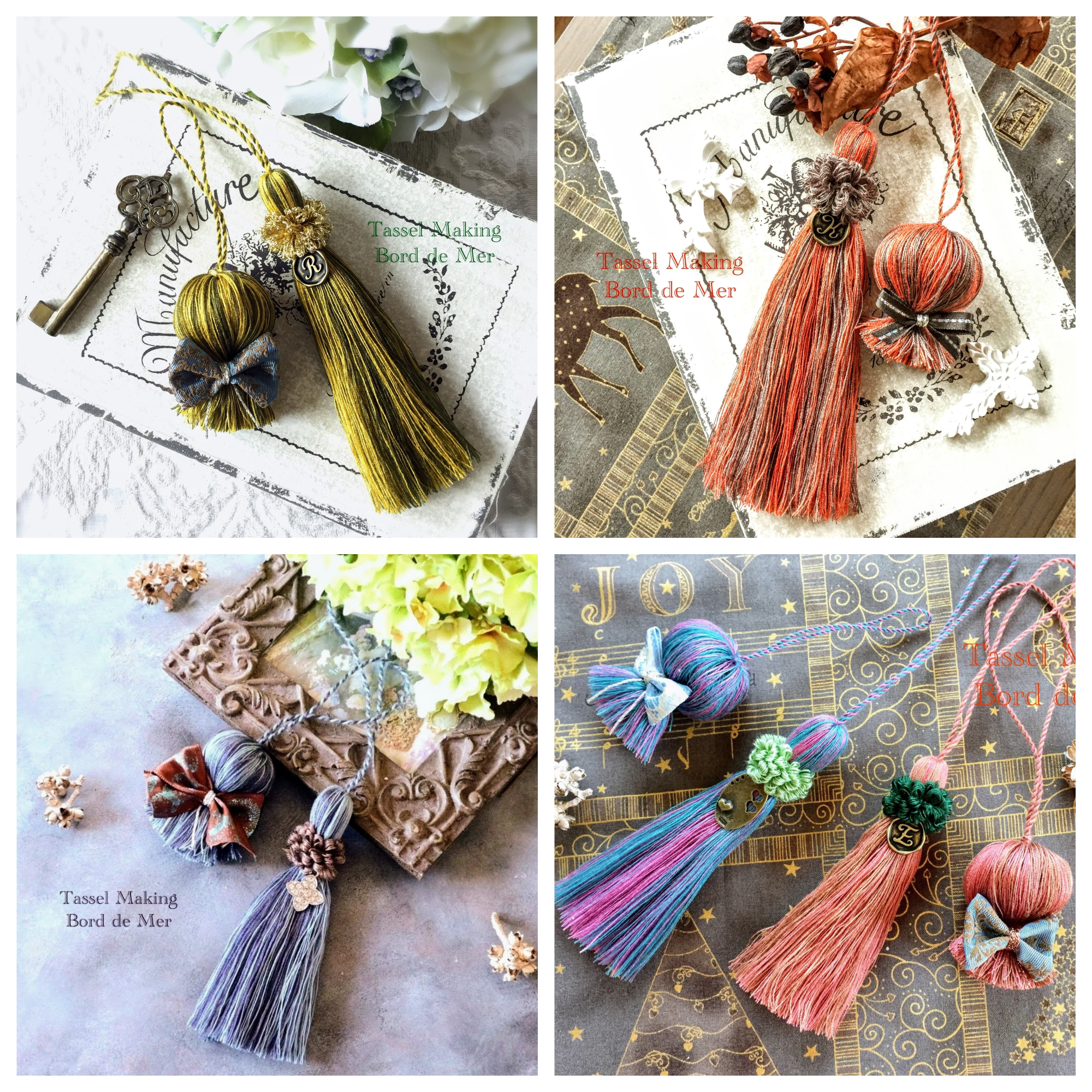 生徒さんたちが作られた作品の抜粋画像からも、いかに色の組み合わせで印象が変わるか、いかに楽しいかが伝わってきませんか?タッセル作りにご興味のある方、ディプロマコースをご検討いただいている方、お教室の雰囲気をご覧になりたい方にお勧めです。