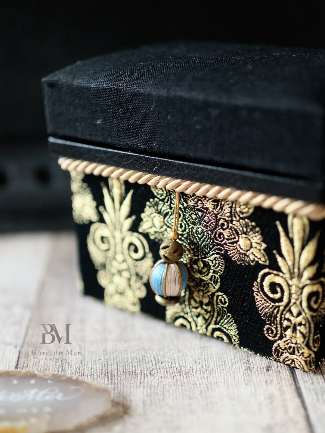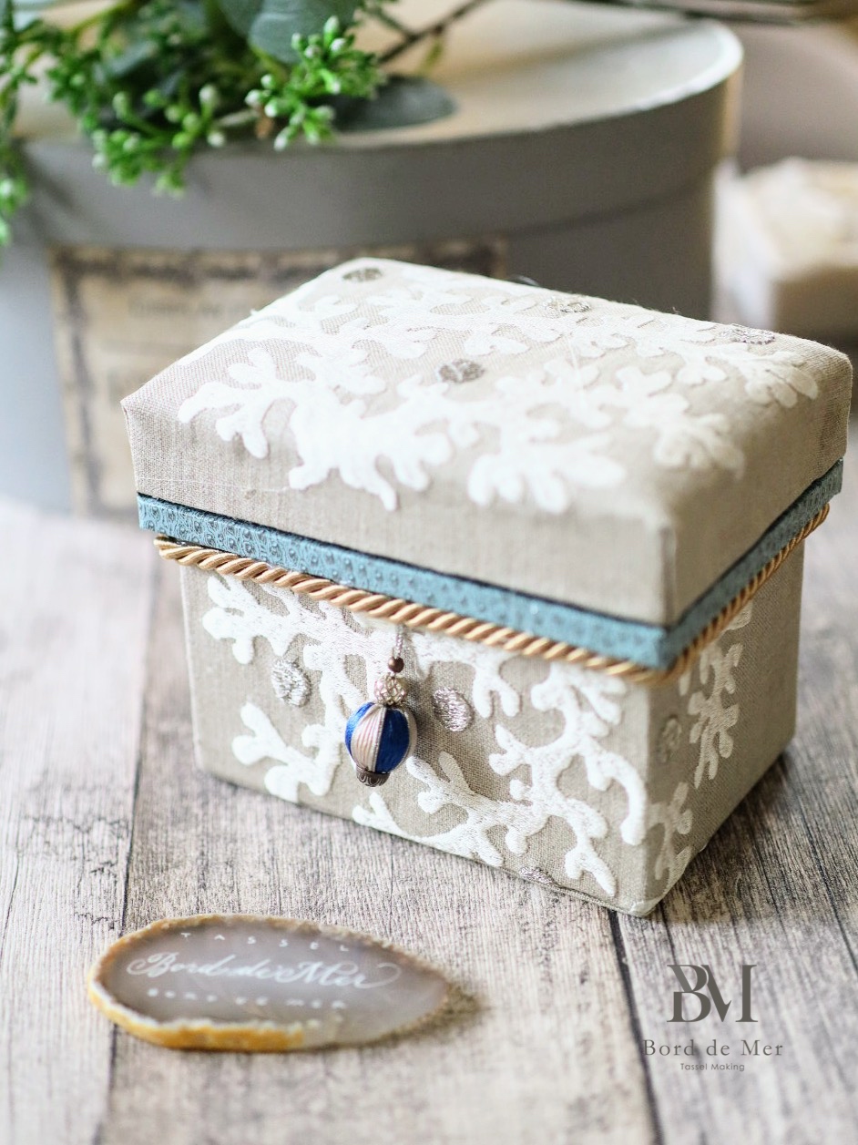 茶箱の形をした手のひらサイズの桐箱に、カルトナージュの技法で完成させます。